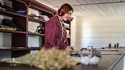 Historic Westville currently has five interpreters who are skilled in traditional trades. Leatherworking and bootmaking are shown in the Singer Boot Shop, while South Georgia quilting is in the Singer House. Traditional carpentry is in the West Wood Shop, while Blacksmithing is in the Woodruff Blacksmith Shop. Westville is also home to a dressmaker that hand-stitches all of the clothing worn by employed interpreters at the site. Historic methods and techniques are used by the craftspeople. Tools from the time period are on display in the houses and occasionally, still used.[9]