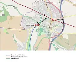 The branch between Wetherby (York Road) and Cross Gates opened on 1 May 1876 as a single-track line linking the Leeds to Selby and Harrogate to Church Fenton lines.[8] The junction at Wetherby only faced towards Church Fenton which meant that the Cross Gates branch was little used for Harrogate services.[8][9] Improvements were made between 1897 and 1902 which saw the line doubled and a south-to-west curve installed to form a triangular junction facing Wetherby.[10][8][9] Its opening led to residential development in the town.[11] A new station to replace York Road station was opened at Linton Road near Wetherby South Junction at the southern apex of the new junction on 1 July 1902.[3][4][9] The works were part of a plan to open the Leeds-Wetherby-Harrogate-Northallerton route for express services.[8]