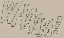 Lichtenstein altered the composition to make the image more compelling, by making the exploding plane more prominent compared to the attacking plane than in the original.[25] The smoke trail of the missile becomes a horizontal line. The flames of the explosion dominate the right panel,[25] but the pilot and the airplane in the left panel are the narrative focus.[46] They exemplify Lichtenstein's painstaking detailing of physical features such as the aircraft's cockpit.[57] The other element of the narrative content is a text balloon that contains the following text: "I pressed the fire control ... and ahead of me rockets blazed through the sky ..."[52] This is among the text believed to have been written by All-American Men of War editor Robert Kanigher.[28][58][59] The yellow word "WHAAM!", altered from the red in the original comic-book panel and white in the pencil sketch, links the yellow of the explosion below it with the textbox to the left and the flames of the missile below the attacking plane.
