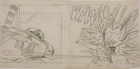 Lichtenstein's romance and war comic-based works took heroic subjects from small source panels and monumentalized them.[19] Whaam! is comparable in size to the generally large canvases painted at that time by the abstract expressionists.[20] It is one of Lichtenstein's many works with an aeronautical theme.[21] He said that "the heroes depicted in comic books are fascist types, but I don't take them seriously in these paintings—maybe there is a point in not taking them seriously, a political point. I use them for purely formal reasons."[22]
