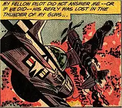 Whaam! adapts a panel by Irv Novick from the "Star Jockey" story from issue No. 89 of DC Comics' All-American Men of War (Feb. 1962).[23][24][25] The original forms part of a dream sequence in which fictional World War II P-51 Mustang pilot Johnny Flying Cloud, "the Navajo ace", foresees himself flying a jet fighter while shooting down other jet planes.[26][27] In Lichtenstein's painting, both the attacking and target planes are replaced by different types of aircraft. Paul Gravett suggests that Lichtenstein substituted the attacking plane with an aircraft from "Wingmate of Doom" illustrated by Jerry Grandenetti in the subsequent issue (#90, April 1962),[28] and that the target plane was borrowed from a Russ Heath[29] drawing in the third panel of page 3 of the "Aces Wild" story in the same issue No. 89.[28] The painting also omits the speech bubble from the source in which the pilot exclaims "The enemy has become a flaming star!"[30]