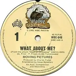 "What About Me" is a song written by Garry Frost and Frances Swan. It was first recorded by Australian rock band Moving Pictures, of which Garry Frost was a member, for its 1981 debut album, Days of Innocence. It became the band's first and only number-one single in Australia, spending six weeks atop the Kent Music Report; it was the second-highest-selling single of 1982 there. At the 1982 Countdown Music Awards, the song won Best Australian Single.[1][2] In January 2018, as part of Triple M's "Ozzest 100", the 'most Australian' songs of all time, "What About Me" was ranked number 37.[3]