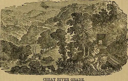 On March 27, 1853, around 3 o'clock, P.M.,[3] a two-engine train carrying four cars (three of which were full of passengers) departed from Wheeling was crossing the bridge over the Cheat River. As the train passed over the already-loose crossties, the nails holding the beams in place detached. The train derailed as a result and sent the cars down the hundred-foot embankment.[2]