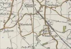 Whinburgh and Westfield is a civil parish in the English county of Norfolk. Its settlements are the small villages of Whinburgh and Westfield. For the purposes of local government, it falls within the district of Breckland. The civil parish lies to the south of the town of Dereham; Whinburgh village is about 3 miles (5 km) from the centre of the town. The parish population at the 2021 census was 390.[1]
