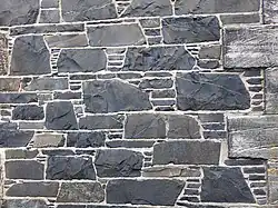 It is used for road chippings and dry stone walls, but its natural angular shapes do not fit together well and are not easy to build with, and its hardness makes it a difficult material to work. A common use is in the laying of patios and driveways in its ground/by product state called Whindust.