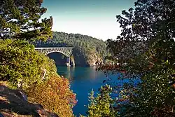 Whidbey Island (historical spellings Whidby, Whitbey,[5] or Whitby) is the largest of the islands composing Island County, Washington, in the United States, and the largest island in Washington state. Whidbey is about 30 miles (48 km) north of Seattle, and is separated from the Olympic Peninsula in the southwest by Admiralty Inlet. The island forms the northern boundary of Puget Sound. It is home to Naval Air Station Whidbey Island. The state parks and natural forests are home to numerous old growth trees.