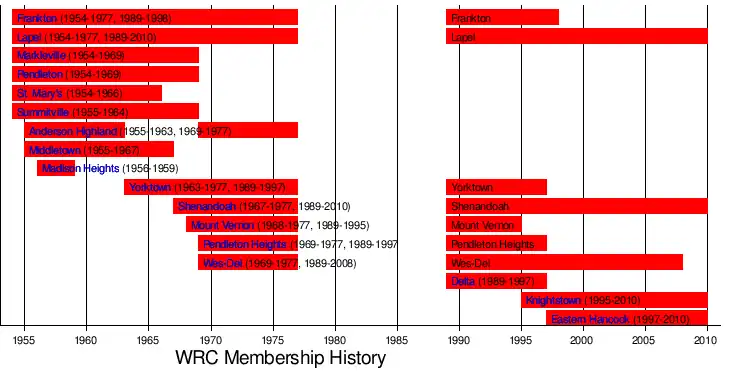 This lineup would remain intact until 1995, though a massive change would happen in the next three years as five schools left. Delta, Mount Vernon, and Pendleton Heights would all leave for the Hoosier Heritage Conference, while Yorktown would join the Rangeline Conference before also ending up in the HHC. Frankton would join the more geographically compact Central Indiana Athletic Conference in 1998, joining fellow northern Madison County schools Alexandria and Elwood. The WRC countered by adding two former BBRC schools: Knightstown (1995) and Eastern Hancock (1997). While the number of members in the conference shrank, its five members were of similar size and demographic. The conference remained stable for the next decade.