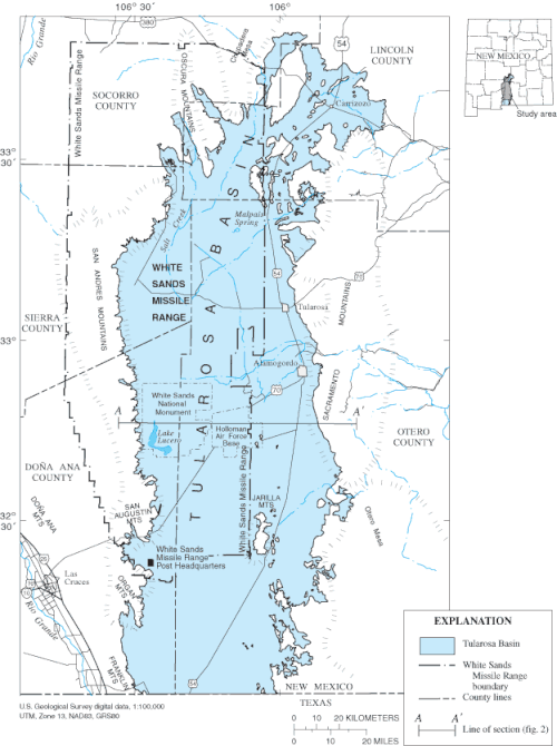 ![]() Most of the northern Tularosa Basin (blue) is used for the WSMR (area within dashed perimeter), which encloses numerous areas that are not military land (e.g., the NPS's White Sands National Park), as well as United States Air Force facilities. | |