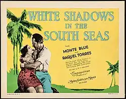 White Shadows in the South Seas is a 1928 American synchronized sound romantic adventure film directed by W.S. Van Dyke and starring Monte Blue and Raquel Torres. It was produced by Cosmopolitan Productions in association with MGM and distributed by MGM.[2] While the film has no audible dialog, it was released with a synchronized musical score with sound effects using the sound-on-film Western Electric Sound System process. Loosely based on the travel book of the same name by Frederick O'Brien, this film is important historically for being the first sound MGM film to be released with a pre-recorded soundtrack. Clyde De Vinna won an Academy Award for Best Cinematography.[3]