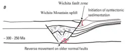 During the Pennsylvanian Period (330–290 million years ago) the region was subjected to intense pressure during the continental collision or orogeny which produced the Ouachita Mountains to the east.[19] This resulted in faulting and folding striking along a WNW direction and includes the Arbuckle and Wichita Mountains of southern Oklahoma and the Amarillo Uplift of the Texas Panhandle.[19] Up to 20,000 feet (6,100 m) of local uplift occurred during this time.[20]