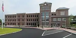 Ground was broken for the new station on August 18, 2010.[22] Primary construction work on the station platform and garage was completed on time and under budget in December 2011, and a test train was run to the station in March 2012.[14][23] The station opened on April 23, 2012.[24][20] A major part of the modern station is the four-story parking garage, which was modeled after the nearby Lafayette Mill. The garage includes an indoor waiting room—rare in the MBTA system—and a small coffee/snack shop.[25] An 8-foot (2.4 m)-tall bronze sculpture celebrating the history of rail service at Wickford Junction was completed in October 2015.[26]