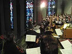 Concerts and other events are held every two years around November.[1] Each festival has a motto, and events include lectures, chamber music, organ concerts and the organ competition, and large choral concerts. The events are held mostly in Wiesbaden churches, such as the Marktkirche, Lutherkirche, St. Bonifatius and Bergkirche. They have been performed by both local groups and international artists.[4][5] The motto in 2015 was "Vom Himmel auf Erden" (Of Heaven on Earth), with Fauré's Requiem sung by a festival choir conducted by Andreas Großmann at St. Bonifatius, Dvořák's Requiem at the Marktkirche, and Elgar's The Dream of Gerontius at the Lutherkirche.[6]