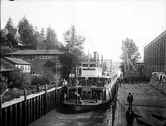 ![]() Steamboat and barge traffic in the lock, c. 1915 | |