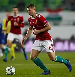 On 8 October 2020, Orbán scored his fourth international goal for Hungary against Bulgaria in a UEFA Euro 2020 qualifying play-off semi-final, as the Magyars won 3–1 in Sofia.[126] On 13 November, he played the full 90 minutes as Hungary beat Iceland in the play-off final to qualify for the 2020 European Championship.[127] On 1 June 2021, Orbán was included in the final 26-man squad to represent Hungary at the rescheduled UEFA Euro 2020 tournament.[128] He played all three of the team's Group F matches at centre back as the Magyars lost to Portugal and drew with both France and Germany.[129] On 7 September 2023, he scored the winning goal in a 2–1 victory against Serbia national football team in the UEFA Euro 2024 qualifying match at the Stadion Rajko Mitic in Belgrade, Serbia.[130][131] After the match, he was voted the best player against Serbia by the readers of Nemzeti Sport.[132] On 10 September 2023, he suffered a knee injury in a friendly tie against Czech Republic.[133][134] On 24 October 2023, Philipp Hinze said that Orbán's convalescence was faster than predicted.[135] In an article published on Nemzeti Sport, Zsolt Somogyi said that Orbán cannot be substituted and his absence is a huge problem for the national team. Orbán had to miss the matches between October and November 2023 against Serbia, Lithuania, Bulgaria, and Montenegro. In these four matches, the national team conceded six goals.[136]