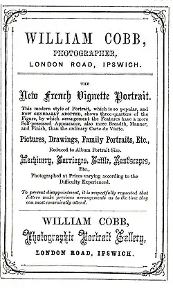 Cobb had his premises in 1 Clarkson Street, Ipswich[2] and also supported Richard Dykes Alexander, an amateur photographer who lived nearby.[3] Cobb left Ipswich in 1868, his departure marked by a valedictory note in the Ipswich Journal which remarked that he had made a significant contribution to the development of the photographic art in Ipswich.[4]