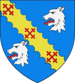 Arms of Cowper: Azure, on a bend engrailed, Or, between two wolf's heads erased, Argent, three cross crosslets, Gules[1]