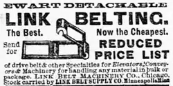 William Dana Ewart (April 24, 1851 – May 3, 1908) invented and patented the linked belt, a square detachable link for chain belts, on September 1, 1874. The metal chain "linked belt" replaced the leather and strap belts used on agricultural equipment at the time.