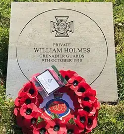 On 9 October 1918, Holmes' battalion was advancing towards the villages of Cattenières and Estourmel when it was held up by machine-gun fire. While under heavy fire, Holmes retrieved two wounded men. While assisting a third wounded soldier he himself was wounded. He remained in the frontlines until he was shot in the throat and died of his wounds. Cattenières was captured the following day. For his actions of 9 October, Holmes was awarded the Victoria Cross (VC).[3] The VC, instituted in 1856, was the highest award for valour that could be bestowed on a soldier of the British Empire.[4] The citation for Holmes' VC read: