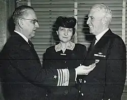 Thomas brought completion to the first historical volumes of the Chaplain Corps.[21] District chaplains were given added prominence and the first District Chaplains Conference was held in 1946.[22] Under the leadership of Thomas, the first official manual ever issued for the use of the Chaplain Corps was issued was in August 1947.[23] He helped formalize post-graduate studies for chaplains. It is thought that the circuit riding chaplaincy ministry on destroyers was based on Thomas having been a circuit rider in Mississippi.[24] In January 1947 Thomas was awarded the Legion of Merit.[25]