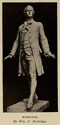 Partridge created two larger-than-life bronze statues of Alexander Hamilton, executed 15 years apart. The first was commissioned by the Hamilton Club of Brooklyn, installed in front of the club's headquarters in Brooklyn Heights, and dedicated on October 4, 1893.[5] For months before and after that dedication, Partridge's full-size plaster model of Hamilton was on exhibition at the World's Columbian Exposition in Chicago.[5] The bronze statue stood in Brooklyn until 1936, when it was relocated to The Grange, Hamilton's country house in northern Manhattan.[5] The second Hamilton statue was commissioned by the Alumni Association of Columbia College [now University].[6] It was installed on campus in front of Hamilton Hall, and dedicated on May 27, 1908.[6] Both Hamilton statues stand in northern Manhattan, less than 1.5 mi (2.4 km) apart.