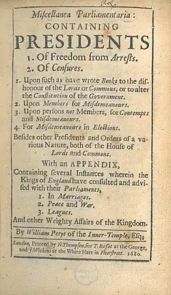 - ^ a b William Petyt (1680), Miscellanea Parliamentaria: Containing Presidents 1. Of Freedom from Arrests. 2. Of Censures. 1. Upon such as Have Wrote Books to the Dishonour of the Lords or Commons, or to Alter the Constitution of the Government. 2. Upon Members for Misdemeanours. 3. Upon Persons not Members, for Contempts and Misdemeanours. 4. For Misdemeanours in Elections. Besides other Presidents and Orders of a Various Nature, both of the House of Lords and Commons. With an Appendix, Containing Several Instances wherein the Kings of England have Consulted and Advised with their Parliaments, 1. In Marriages. 2. Peace and War. 3. Leagues. And other Weighty Affairs of the Kingdom. By William Petyt of the Inner-Temple, Esq; (1st ed.), London: Printed by N. Thompson, for T. Basset at the George, and J. Wickins at the White Hart in Fleetstreet, OCLC 12430989.