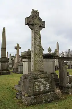 He died of a heart attack at his home, 20 Sandyford Place,[6] in Glasgow on 19 August 1907 and is buried in Glasgow Necropolis, near the summit.[7]