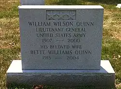 William Wilson "Buffalo Bill" Quinn (November 1, 1907 – September 11, 2000)[1] was a United States Army officer, who served in intelligence during World War II. Born in Crisfield, Somerset, Maryland and a 1933 graduate of West Point, Quinn retired as a lieutenant general on March 1, 1966 as the commanding general of the Seventh United States Army. He died in Washington, DC at Walter Reed Army Hospital at 92 years old.
