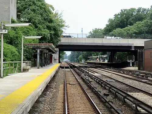Williams Bridge station (also known as Williams Bridge–East 210th Street station) is a commuter rail stop on the Metro-North Railroad's Harlem Line, serving the Williamsbridge and Norwood sections of the Bronx, New York City. The station is located at the intersection of Gun Hill Road and Webster Avenue. The station has two offset high-level side platforms, each four cars long, serving the outer tracks of the four-track line.[3]: 10