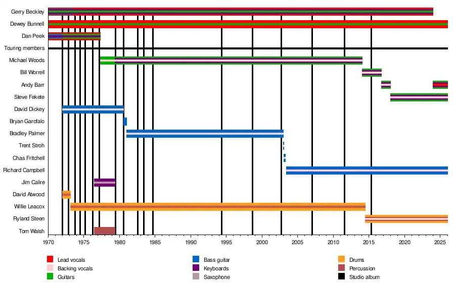 - Gerry Beckley – lead and backing vocals, keyboards, guitars, bass, harmonica (1970–present)[a][23]