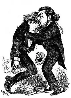 By the time of Oscar's marriage, in 1884, Willie was seriously in debt and drinking heavily. On 4 October 1891, aged 39, Willie married a wealthy widow, Mrs Frank Leslie (1836–1914), the owner of the Frank Leslie Publishing Company in New York.[7] She was initially attracted by Willie's humour and wit. He proceeded to spend much of his time in New York drinking at the fashionable Lotos Club, gossiping about London Society and reciting parodies of his brother's poems, which perhaps suggests that he was jealous of Oscar's success. His marriage was short-lived, Mrs Leslie starting divorce proceedings within a year on the grounds of Willie's drunkenness and adultery. They were finally divorced on 10 June 1893.[8][9]