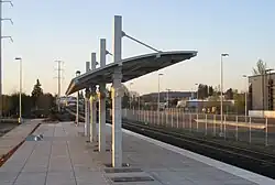 Wilsonville station, WES's southern terminus, was built by contractor Stacy and Witbeck.[6] The stop includes a park-and-ride lot with 400 spaces along with the platform.[6] The platform includes a shelter for waiting passengers measuring 40 feet (12 m) long.[6] The station includes 12 bays for the transit center and a 17,000-square-foot (1,600 m2) maintenance building for SMART buses.[7] Future plans call for a mixed-use development to include SMART offices, retail shops and restaurants, along with public restrooms, bicycle storage and an outdoor play area.[7]