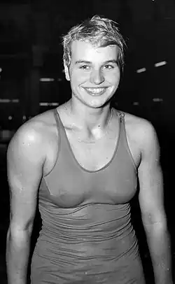 Wiltrud Urselmann (German pronunciation: [ˈvɪltʁuːt ˈʊʁzl̩ˌman] ⓘ; born 12 May 1942) is a German former breaststroke swimmer. In 1957 she was named the German Sportspersonality of the Year for her national achievements. She then won a bronze medal in the 200 m breaststroke at the 1958 European Aquatics Championships.[1] On 6 June 1960 she set a new world record in the same event (02:50.2), beating the previous record of Anita Lonsbrough. Two months later, in the 1960 Summer Olympics finals, she swam even faster (2:50.0), but was beaten in the last 25 meters by Lonsbrough (2:49.5).[2]