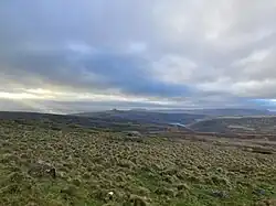 The hill's counterpart, Lose Hill, lies to the west on the opposite side of the River Noe. In relatively recent times, the two hills' names have prompted a fanciful tale concerning the outcome of an imagined 7th-century battle between the forces of Edwin of Northumbria and Cynegils of Wessex.[1] Edwin's forces occupied Win Hill, while Cynegils' men camped on Lose Hill. As the battle progressed, Cynegils' forces advanced up Win Hill, and Edwin's retreated behind a temporary wall they had built near the summit. They pushed the boulders of the wall downhill, crushing the Wessex soldiers and gaining victory in the battle. However, there is no historical basis for the tale, and no evidence of any battle ever being fought here. A more prosaic explanation for the name is that Win Hill was originally recorded as Wythinehull, meaning "Withy Hill" or "Willow Hill". Fragments of willow can still be found in the otherwise largely coniferous plantation on the approach from Yorkshire Bridge.[2]