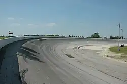 The original half-mile clay oval was built in a cornfield by Frank Funk in 1914, and the track opened in 1916 with the name of Funk's Speedway.[1] As owner and operator, Funk pursued a two-pronged strategy to attract spectators. First, he recognized that attendance went up as the clay banks were raised higher and higher, reaching 25 feet by 1932, and the turns were said to be banked at 45° in 1948.[2] In 1932, the track could seat 6,000 in the grandstands, with the grounds accommodating 12,000 to 14,000.[3]