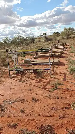 Windorah Cemetery is managed by the Barcoo Shire Council.[38] It is on Cecil Street to the north of the town (25°24′55″S 142°39′12″E / 25.4153°S 142.6534°E).[39]