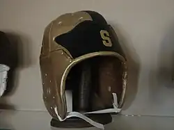 Early football helmet designs incorporated panels of leather, which were sometimes manufactured using strips of contrasting color. The Indiana and Michigan State football teams also adopted variations on the design. Michigan State's helmet used a colored stripe (matching the color of the wings) running down the spine of the helmet, while Indiana's version featured three such stripes, nearly identical to the form used today. The Georgetown Hoyas also used a winged helmet for several seasons during the 1930s and 1940s.[1][2]