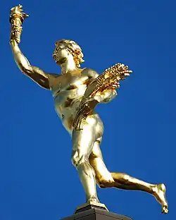 The Manitoba Legislative Building is the meeting place of the Legislative Assembly of Manitoba,[9] in central Winnipeg. It was originally named the Manitoba Parliament Building, not Legislative.[9] The neoclassical building was completed in 1920 and stands seventy-seven meters tall (253 ft).[9] It was designed and built by Frank Worthington Simon (1862–1933)[10] and Henry Boddington III, along with other masons and many skilled craftsmen. The building is famous for the Golden Boy, a gold covered bronze statue based on the style of the Roman god Mercury, or the Greek god Hermes, at the top of the cupola, or domed ceiling.