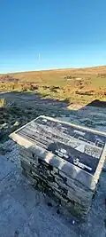A metal plaque shows the direction for Two Lads Cairn, Winter Hill TV mast, Smithills Moor, Brown Lowe, Scout Moor Wind Farm, Knowl Hill, Walker Fold Woods, Saddleworth Moor, Peak District, Kinder Scout, Manchester and Salford Quays. The image on the left shows Winter Hill and the TV mast along with Holdens Farm. On the plinth is a metal memorial plate which reads "In loving memory to Joan and Bartle Hodgkiss...". The plaque is on a continuing path along Burnt Edge Lane, 200m past Slack Hall and overlooking Burnt Edge at SD666124.