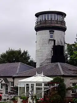 In 1840 a pair of 'neat houses' were erected on the cliff as residences for the keepers;[2] according to several sources the tower was rebuilt at the same time.[23] It was described in 1848 as 'on an eminence south-east of the village […] a lighthouse of late erection, an hexagonal tower seventy feet high, lighted with patent argand lamps and reflectors'.[24] In 1854 the tower was painted red so as to render it more distinctly visible during the day (the adjacent cottages remained painted white).[25]