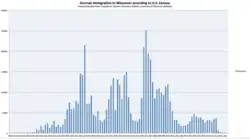 The term Wisconsin German refers to both Wisconsin High German and to heritage dialects of German spoken in Wisconsin.[1]: 5 By 1853, a third of Wisconsin's population was coming from German-speaking lands; by the end of the 19th century, Wisconsin's largest minority of non-English speakers were German speakers.[2]: 37 Unlike other heritage languages, which tend to become moribund by the third generation, Wisconsin German speakers have maintained their heritage language(s) alongside English for multiple generations,[1]: 5 from the 1840s to well until the mid-20th century. This is due in part to their immigration patterns: the German immigrants tended to settle within ethnically homogeneous (or similar) communities,[3][4] with similar linguistic, cultural, and geographic backgrounds.[1][4]: 119–120 Additionally, the maintenance of the language was supported by German being taught and used in many local churches, schools, and the press.[3] While Wisconsin German retains many standard and/or dialectal features of German, it has not only incorporated some linguistic elements of English, but also developed unique and innovative (morphosyntactic,[1] syntactic,[5] lexical[6]) characteristics of its own. By the early mid-20th century, social, political and economic factors such as urbanization and severe persecution during World War I, contributed to a general shift from German to English.[4]