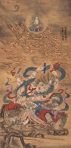 Other Wisdom Kings followed a more or less similar development. Hayagrīva, for example, was originally the horse-headed incarnation of the Hindu god Vishnu which was adopted into Buddhism as Avalokiteśvara's attendant (although unlike the Hindu Hayagrīva, the Buddhist figure was never portrayed with a horse's head, instead being depicted like Yamāntaka as a yaksha who may have a miniature horse head emerging from his hair).[20] Eventually, as Hayagrīva increasingly rose to prominence, the distinction between him and his superior became increasingly blurred so that he ultimately turned into one of Avalokiteśvara's many guises in both China and Japan.[21] One of the more famous vidyārājas, Acala (Acalanātha), was originally an acolyte or messenger of the buddha Vairocana before he was interpreted as Vairocana's fierce aspect or kyōryōrin-shin in the Japanese tradition.[22] (In Nepal and Tibet, meanwhile, he is instead identified as the incarnation of either Mañjuśrī or the buddha Akṣobhya.[23][24][25][26])