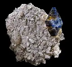 Two growth habits of anatase crystals may be distinguished. The more common occurs as simple acute octahedra with an indigo-blue to black color and steely luster. Crystals of this kind are abundant at Le Bourg-d'Oisans in Dauphiné, France, where they are associated with rock-crystal, feldspar, and axinite in crevices in granite and mica schist. Similar crystals of microscopic size are widely distributed in sedimentary rocks such as sandstones, clays, and slates, from which they may be separated by washing away the lighter constituents of the powdered rock.[8] The (101) plane of anatase is the most thermodynamically stable surface and thus the most widely exposed facet in natural and synthetic anatase.[10]