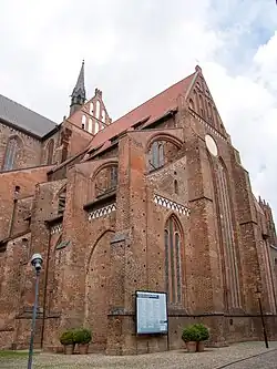 The 80-metre-high (260 ft) tower church of St. Mary's Church (Marienkirche) is the only remainder of the original Brick Gothic edifice, built during the first half of the 13th century. It suffered heavy damage in World War II and was partially razed in 1960 during the East German era.