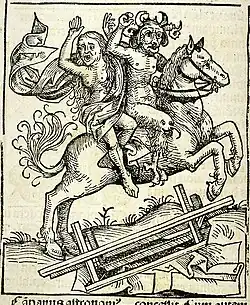 The Witch of Berkeley is a medieval English legend written by monk William of Malmesbury that acts as an allegory of the fate of sinners. The story begins with a woman who is addicted to witchcraft and skilled in ancient augury. The woman used her expertise in dark magic to become very rich and lascivious in appearance but was declining in health and nearing death. The woman is alerted when a jackdaw chirping louder than usual, gave a bad omen revolving around bad news. Shortly after, a messenger arrived and informed the woman that her son and his entire family had died in an accident. Knowing her time was near, the woman raced home and ordered her two remaining children come at once. She admitted that she used demonic arts and was the subject to all vices and allurements. The woman informed her children that evil spirits were coming for her body due to her sinful ways, and that in order for her body to not be taken the children must protect it above ground for three nights, then it can be buried safely on the fourth day. The woman wanted her children to do multiple acts to protect her body, such as sewing the woman’s corpse in the skin of a stag and to bind the coffin with three massive chains. The children completed the woman’s request and put her in the church, but it was in vain. For two nights straight, devils busted through the church doors and broke two of the chains on the woman’s coffin. On the third night, a devil who was “horrendous in appearance,”[2] broke the last chain and dragged the woman from the coffin out of the church. The devil took her on his horse, vanishing from sight, with only the woman’s pitiable cries left behind.[3][4]