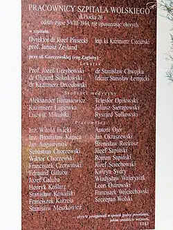 The liquidation of the Wola Hospital on "Black Saturday," 5 August 1944, resulted in over 360 victims. The Register of places and facts of crimes committed by the Germans during the Warsaw Uprising states that 300 patients and 60 medical and auxiliary staff members were among those shot.[33] Six doctors were murdered – besides Dr. Piasecki and Professor Zeyland, the victims included Professor Dr. Józef Grzybowski, Dr. Olgierd Sokołowski, Dr. Stanisław Chwojka, and Dr. Kazimierz Drozdowski. Long-time Wola Hospital feldsher Stanisław Łempicki, and twenty-three auxiliary male staff members known by name, were also executed. Six medical students, participating in clandestine medical studies conducted under the auspices of the legally operating Private Vocational School for Auxiliary Medical Personnel led by Dr. Jan Zaorski, were also killed. They were Aleksander Banasiewicz, Kazimierz Łągiewka, Ludwik Mikulski, Telesfor Opiłowski, Juliusz Sieragowski, and Ryszard Sułkowski (all of whom were practicing at Wola Hospital).[37] Among the patients and those on hospital grounds, Father Józef Rzychoń of the Congregation of the Mission (prefect of the Silesian seminary in Kraków from 1937 to 1940) and Antoni Braunschweig (a seminarian from the Warsaw seminary) were also killed.[38]