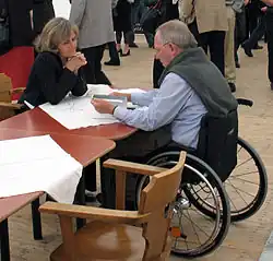 Following the elections, Schäuble was mentioned as potential candidate for the office of Federal Minister of Defense.[37] In the subsequent negotiations to form a coalition government, he led the CDU/CSU delegation in the working group on interior policy; his co-chair from the SPD was Brigitte Zypries.[38] Once the new government was formed, Schäuble once again became Minister of the Interior, this time in the Grand Coalition under Chancellor Angela Merkel.[39]