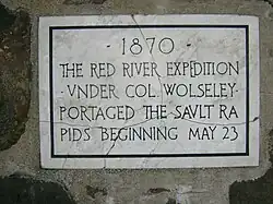 The expedition travelled to Georgian Bay, then by steamer across Lake Huron to the U.S. Sault Canal where men and materiel had to be transported on the Canadian side of the river. The two steamers hired by the Canadian government were the Algoma and the Chicora.[9] The St. Marys canal went through the territory of the United States, critical to moving supplies northward. The first steamer, the Algoma, made it through before the Chichora was stopped. American border agents stopped the steamers due to the movement of soldiers and the materials of war, which were viewed as a threat. The U.S. authorities forced Wolseley to unload the Chicora of all soldiers and materials of wars prior to permitting it to pass.[10] Wolseley then arranged the 4.8 km (3 mi) portage of the soldiers and materials upriver on the Canadian side of the river to be loaded back onto the awaiting Algoma.[11] The expedition then proceeded across Lake Superior to the Department of Public Works station at Thunder Bay, which Wolseley named Prince Arthur's Landing on May 25, in honour of Queen Victoria's third son. From there the troops carried small boats to Lake Shebandowan. On August 3, the first brigades of canoes started their journey towards Fort Garry, leaving from the shores of Shebandowan.[12] The brigades followed the original HBC trapping line until they reached Kashabowie Lake, when they began to follow a new route which Dawson had found and constructed.[13] Travelling further westwards, they passed through Fort Frances, arriving on August 4. Wolseley made it to Lake of the Woods; however, he lost his way. On August 15 he finally made Rat Portage with his flotilla and sent Iroquois guides back to help the remaining brigades cross the river.[14] They proceeded down the Winnipeg River and across the south basin of Lake Winnipeg to the Red River finally arriving at Fort Garry in late August.