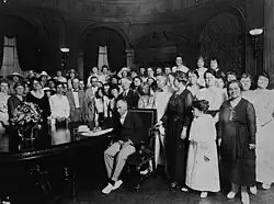 On January 8, 1919, the first bill introduced in the Missouri General Assembly was to allow women in Missouri to vote in presidential elections and was called "Bill Number One".[63] The bill was introduced by a Jasper County representative, Walter E. Bailey in the House and in the Senate by James McKnight from Gentry County.[63] In the Senate, there was some controversy over whether the bill would be able to pass and three women, Marie Ames, Alma Sasse, and Mrs. Wm. Haight, watched the proceedings and made sure that senators who might vote for suffrage would be on the floor during any votes.[63][64] Bill Number One passed the Senate and on February 11, it passed the House with a vote of 122 to 8.[64] After this, the bill went back for the final write up.[64] Some anti-suffrage senators tried to attach amendments in hopes of killing the legislation, but they were unsuccessful.[64] The proceedings stretched into March.[64] In the week of March 23 to 29, 1919, NAWSA held their Golden Jubilee Convention in St. Louis.[48] The final vote for the presidential bill was on March 28.[65] Suffragists worked together to procure a special train for one of the senators who was pro-suffrage and was out-of-town.[64] The bill passed the senate again by 21 to 12.[66] On April 5, 1919, the Presidential Suffrage bill was signed by Governor Frederick D. Gardner while suffragists watched.[48][66]
