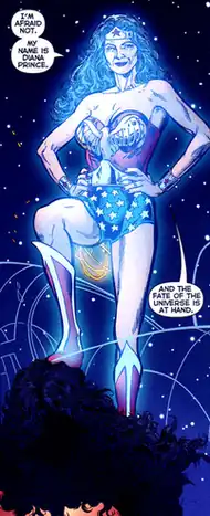 When the new, post-crisis Wonder Woman breaks up a riot in Boston, she is interrupted by a woman she thinks is her mother (Queen Hippolyta); Hippolyta is the golden-age Wonder Woman via time travel in her continuity. The intruder identifies herself as Earth-Two Wonder Woman Diana Prince, who left Mount Olympus in order to guide Diana. She advises her post-Crisis counterpart to be "the one thing you haven't been for a very long time...human".[4] She urges Diana to intervene in a fight between Superman and his counterpart, Kal-L. Having left Mount Olympus, with her gods' blessings gone, Diana Prince fades away.