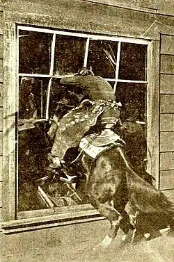 Tom Mix and Tony the Wonder horse jump through a window on set of the film Hell-Roarin' Reform (1919)